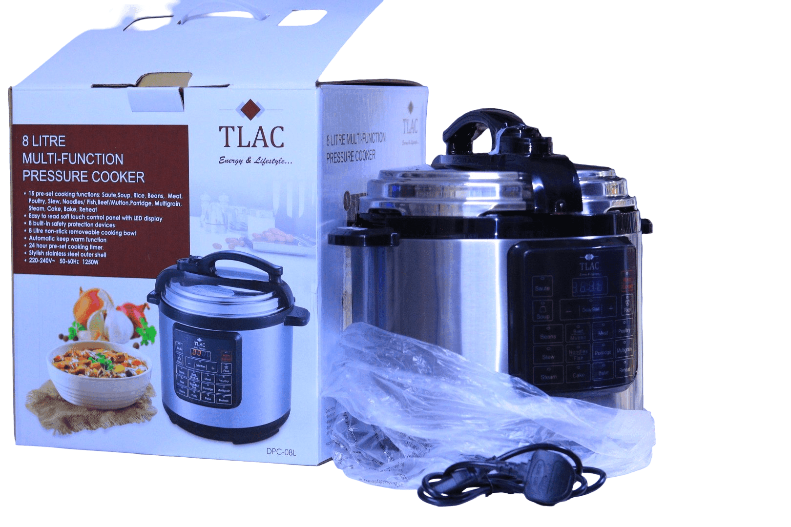 TLAC 8 L Pressure Cooker DPC‑08L is a feature-packed electric cooker built for busy Kenyan households that demand convenience and reliability. With a 1250 W heating element, this handy cooker offers 15 preset cooking programs, including rice, beans, stew, cake, and steam, that simplify multi-modal cooking.